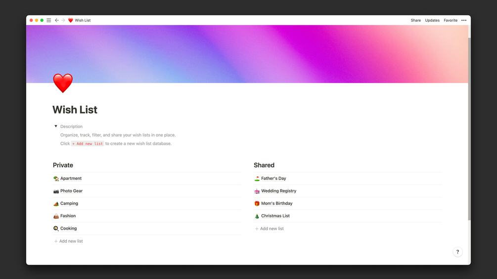 Organize, track, filter, and share your wish lists effortlessly in Notion!