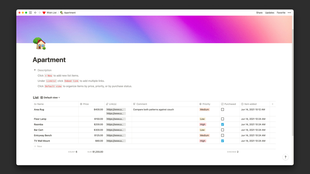 The wish list template will create a table with everything you need to get organized. You can add a name, price, link(s), or comments, designate the priority, check off purchased items, and reference when the item was added. On shared wish lists, you'll also have the option of assigning list items to individuals to identify who it belongs to.